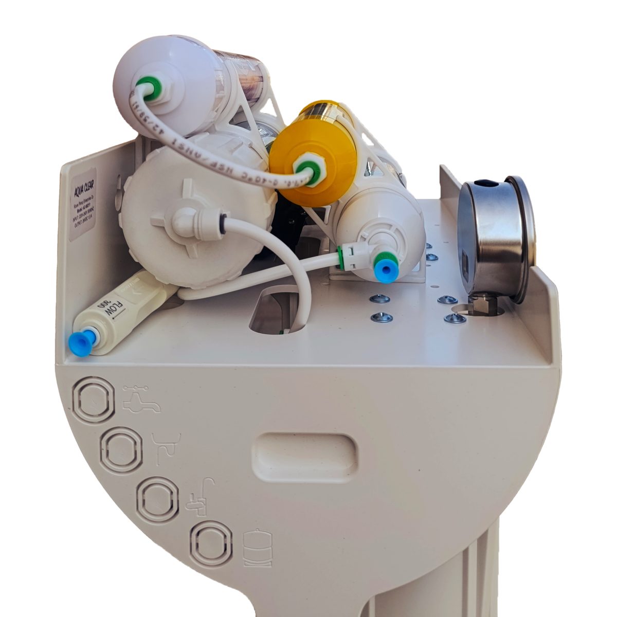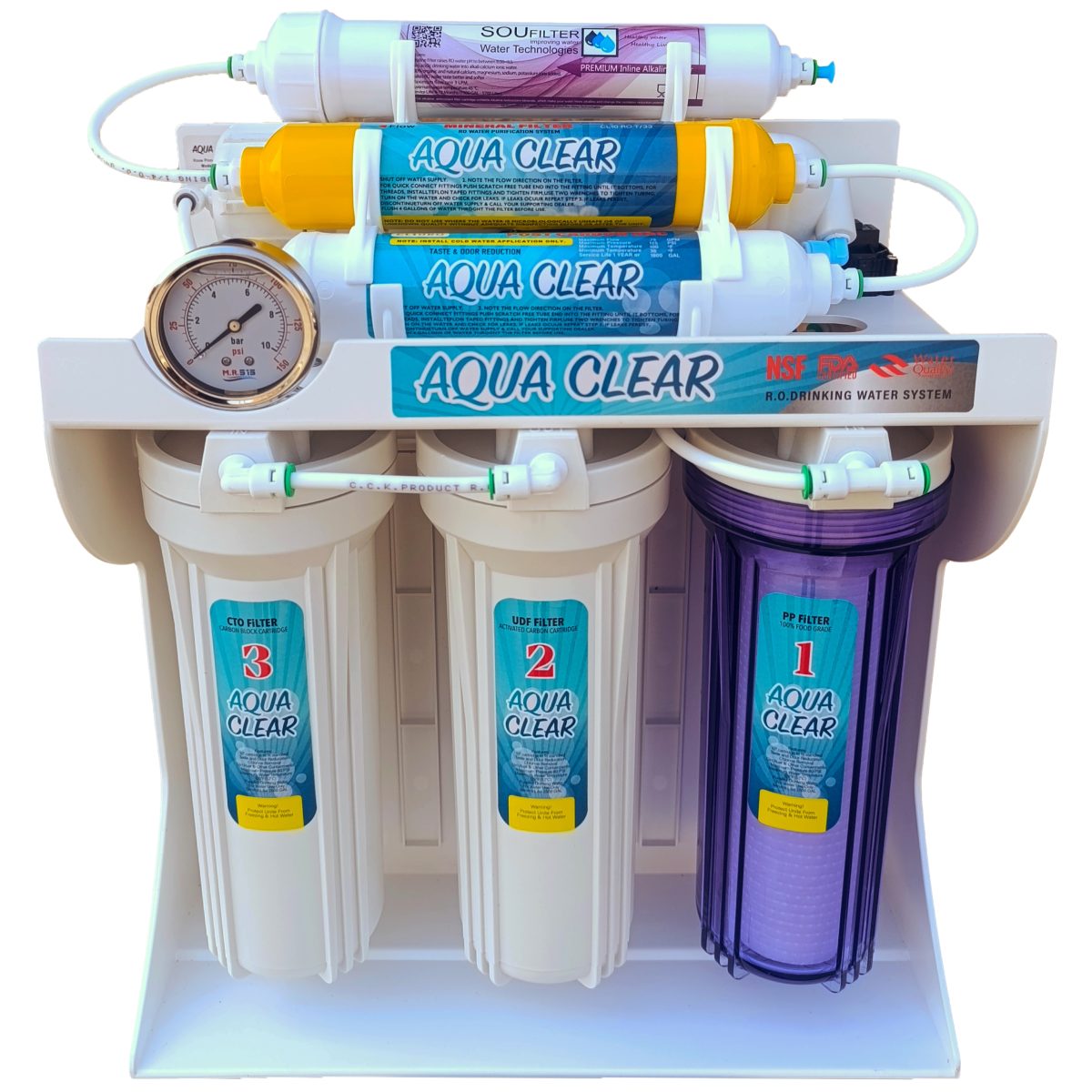 در این دستگاه تصفیه کننده آب خانگی از پمپ مگابوستر فشار قوی و بی صدا aqua clear ، شیر برداشت اهرمی زیبا و منحصر بفرد و فیلتر ممبران (RO) استفاده شده است.